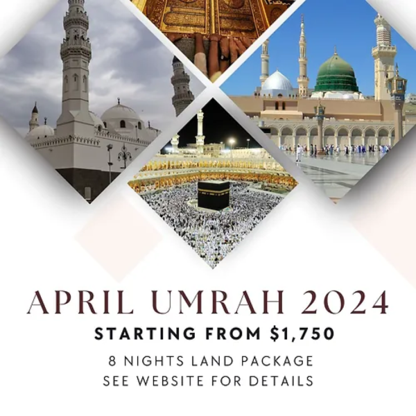Embark on a spiritually enriching journey with our “April Umrah Land Package 2024.” Designed to provide a seamless and enriching pilgrimage experience, this package offers a perfect balance of spiritual immersion and comfort. Enjoy accommodation in premium hotels, guided tours of Makkah and Madinah, high-speed train travel between the two cities, airport transfers, assistance with the tourist visa process, Umrah orientation, Ihram provision for brothers, and visits to all historic sites in Makkah and Madinah.